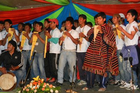 A group shares a zampoñada, a traditional musical presentation using the zampoñas, the Andean panpipe