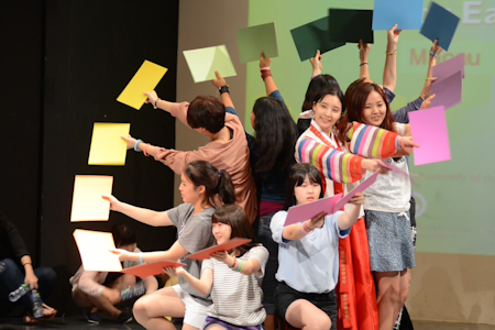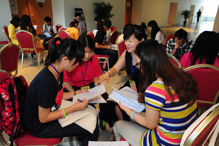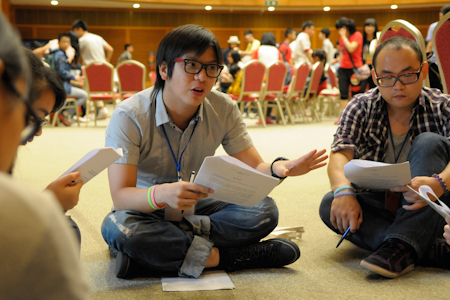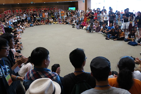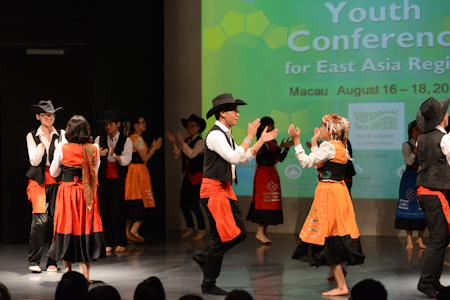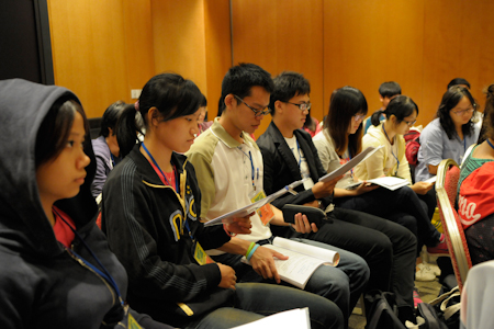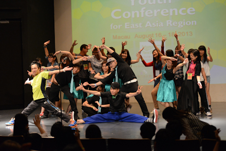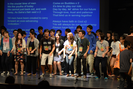 In the workshops and plenary gatherings, the participants were provided ample opportunity to create and share arts that reflected the themes they were discussing. A group from Macau presented a dance called “Stories of Service” where each dancer told the audience what they had learned while offering some acts of service in their communities. Another group presented a skit that illustrated the social forces that affect youth such as backbiting, materialism, competition, and peer pressure, and a group of 12 youth from Hong Kong shared a song they composed called “The Youth Today”. Another inspiring moment was when a number of participants shared the Bahá'í prayer “Blessed is the Spot” with the verses sung in six different languages.