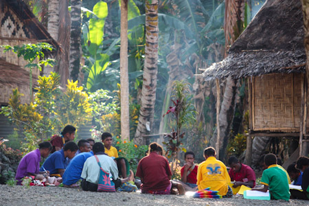 At dawn, a look over the embankment above the river revealed a mass of youthful humanity performing their daily ablutions. By 7 a.m. the school’s field was filled with groups waiting patiently for the morning meal, some singing songs, some earnestly reviewing the materials they had studied the day before, and many continuing conversations about their plans for service. By 7:45 a.m., all 1,385 youth were again assembled to begin the conference program for that day, commencing with prayers and the singing of verses from the Bahá’í Writings in melodious voices echoing throughout the valley. The reverent atmosphere was reflective of the growing devotional spirit of their home communities where friends regularly come together to pray.