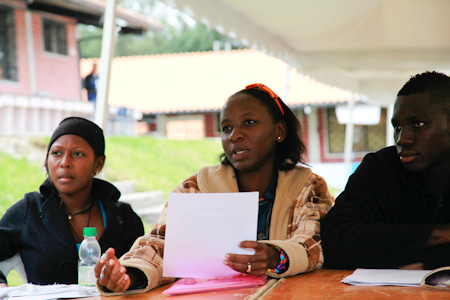 After each morning plenary session, the participants, many of whom had journeyed long distances together, divided into large groups according to their home community. Each group, named after a particular spiritual quality like “Hope”, “Love”, and “Unity”, studied the conference materials together, some using the arts to convey their insights into a particular concept. The diversity of artistic expressions was indicative of the youth’s abundant creativity. The “Unity” group built a mock airplane to articulate the vision that “youth must soar in the spiritual skies of service”; a group from Chongon, nicknamed “Fortitude”, prepared and presented a pantomime that depicted their understanding of some of the ways in which we can be affected by the positive and negative forces surrounding us.